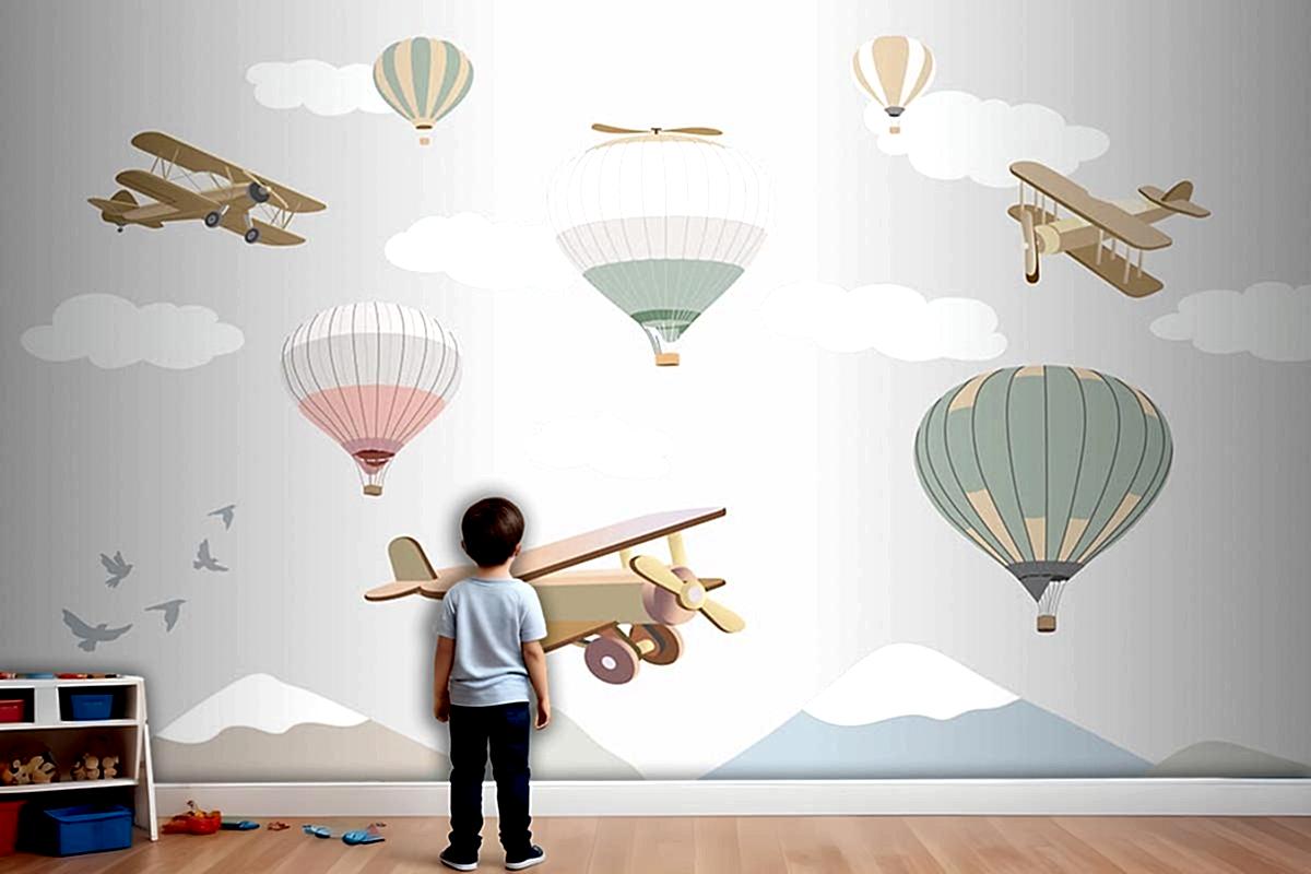 Çocuk Odası Duvar Kağıdı Bulutlar Üzerinde Uçaklar Ve Uçan Balonlar